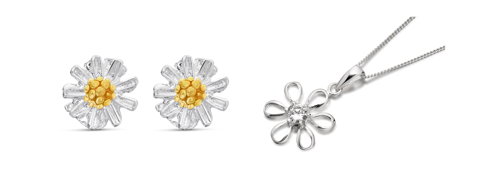 Left to Right; Silver Flower Stud Earrings – 7mm – F01010 – £14.99/ Silver Cubic Zirconia Daisy Necklace – F3403 – £19.95.