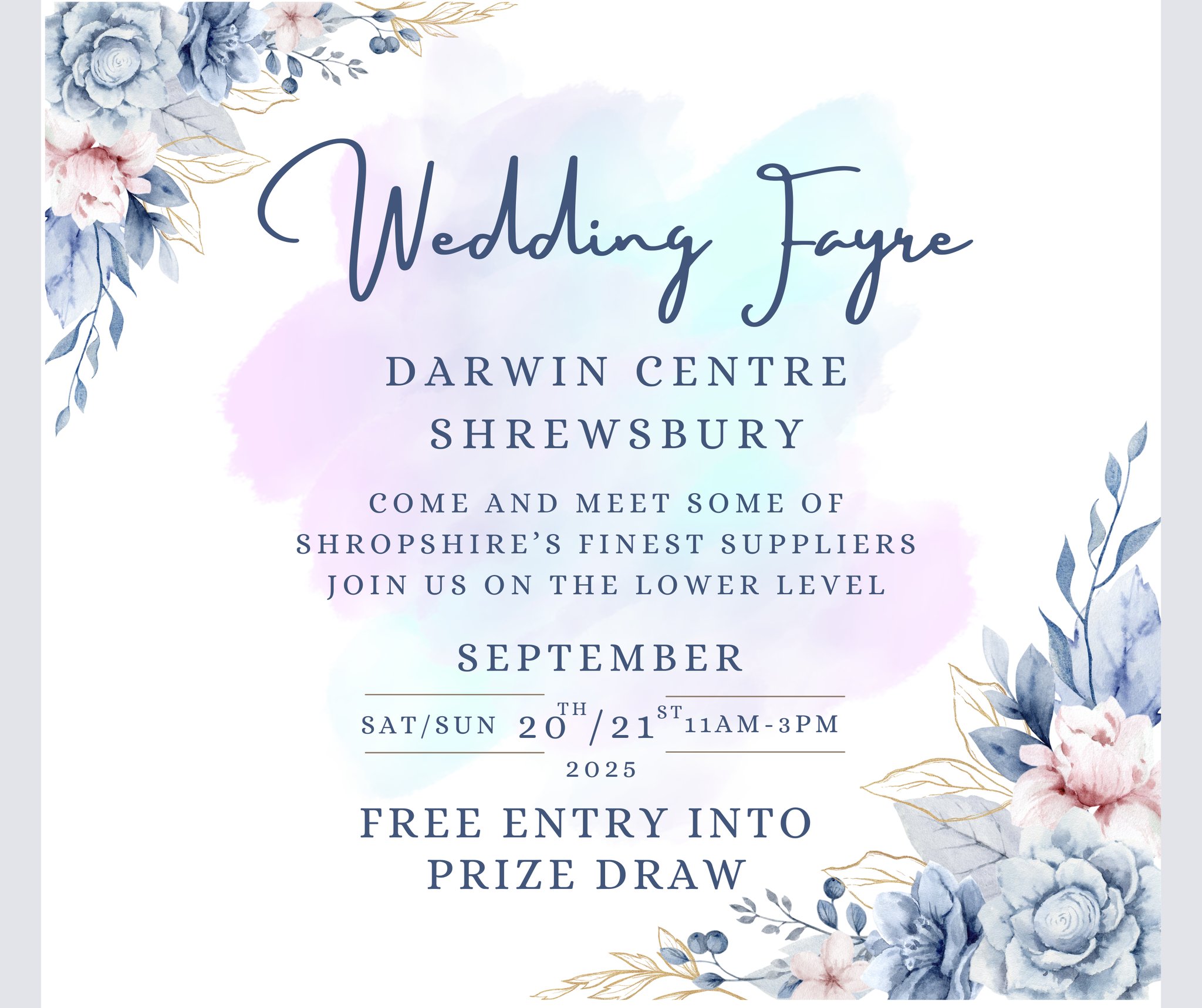 Join us on Saturday 20th and Sunday 21st September, from 11 am to 3 pm, on the lower level of The Darwin Shopping Centre, Shrewsbury. Our Wedding Fayre brings together some of Shropshire’s finest wedding suppliers, carefully curated to help you plan your perfect day with ease and luxury.